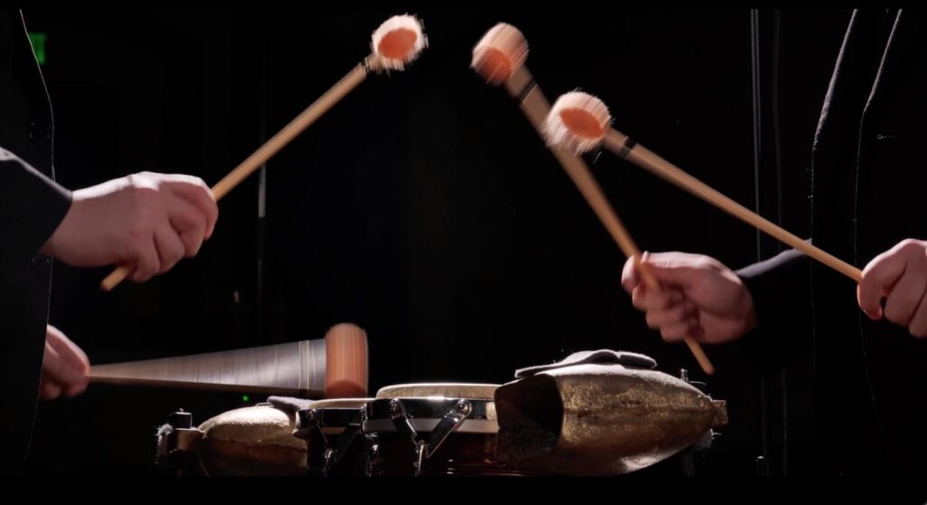 Un patrón en 7/8 inspirado en ritmos latinoamericanos como el Bembé o el Festejo. Se van añadiendo golpes hasta que se tocan todas las semicorcheas. Cada músico interpreta el mismo patrón, turnándose para agregar un nuevo golpe. Ambos tienen un metrónomo independiente.